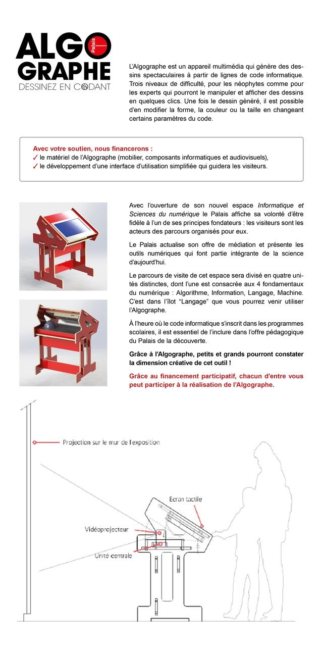 A l'occasion de l'ouverture de l'espace "Informatique et sciences du numérique" au Palais de la découverte à Paris, les visiteurs pourront expérimenter l'impact graphique du code informatique. Grâce à l'Algographe, le code apparaît comme un véritable outil créatif pouvant rivaliser avec la peinture ou le dessin !